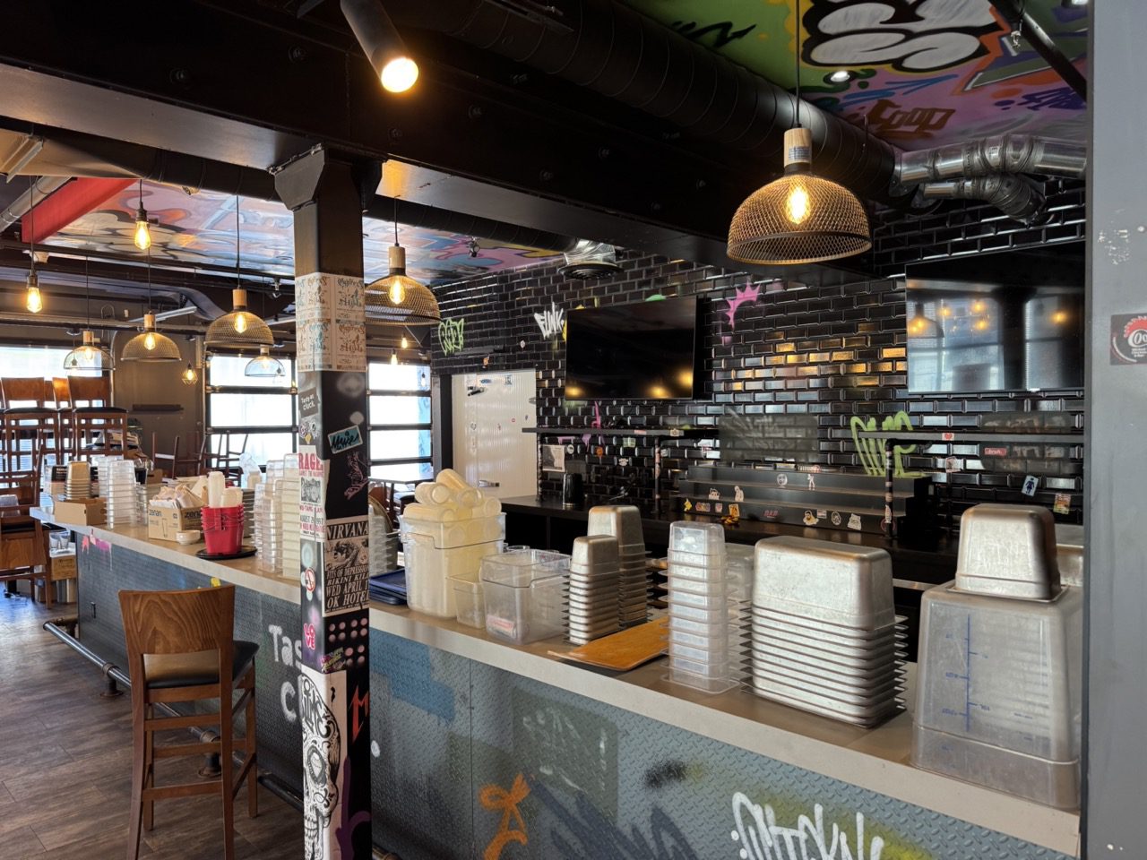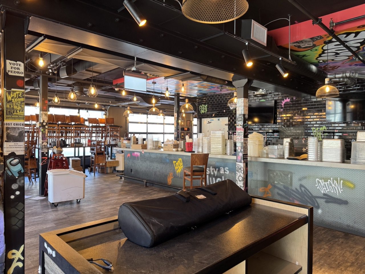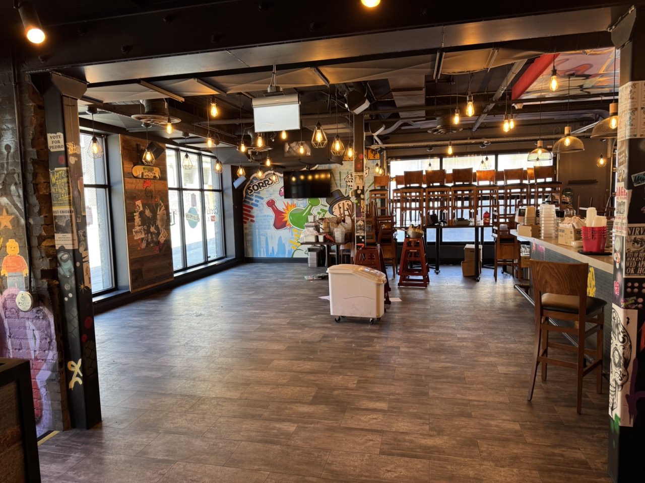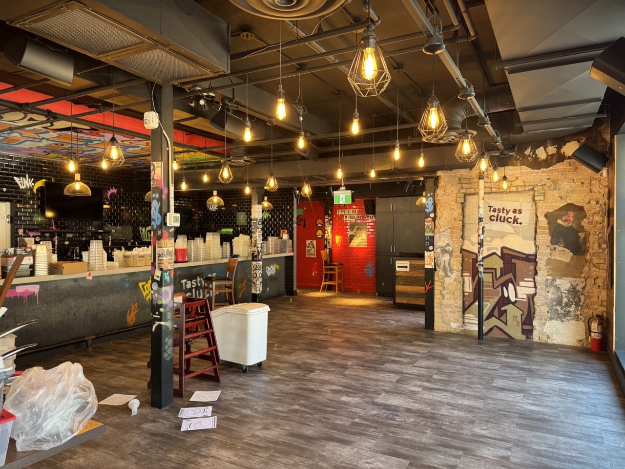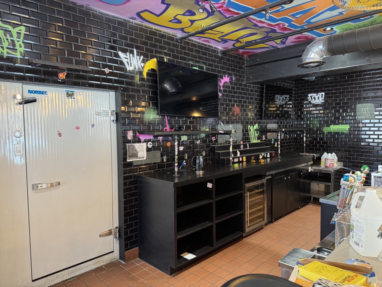 Fully built out in 2022, this modern restaurant space is completely equipped with high-quality finishes and equipment throughout, including True fridges and freezers, 55-inch TVs, a 10-tap draught tower, professional sound system, large kitchen exhaust hood, camera system, banquettes, tables, chairs, flat tops, fryers, and much more.
